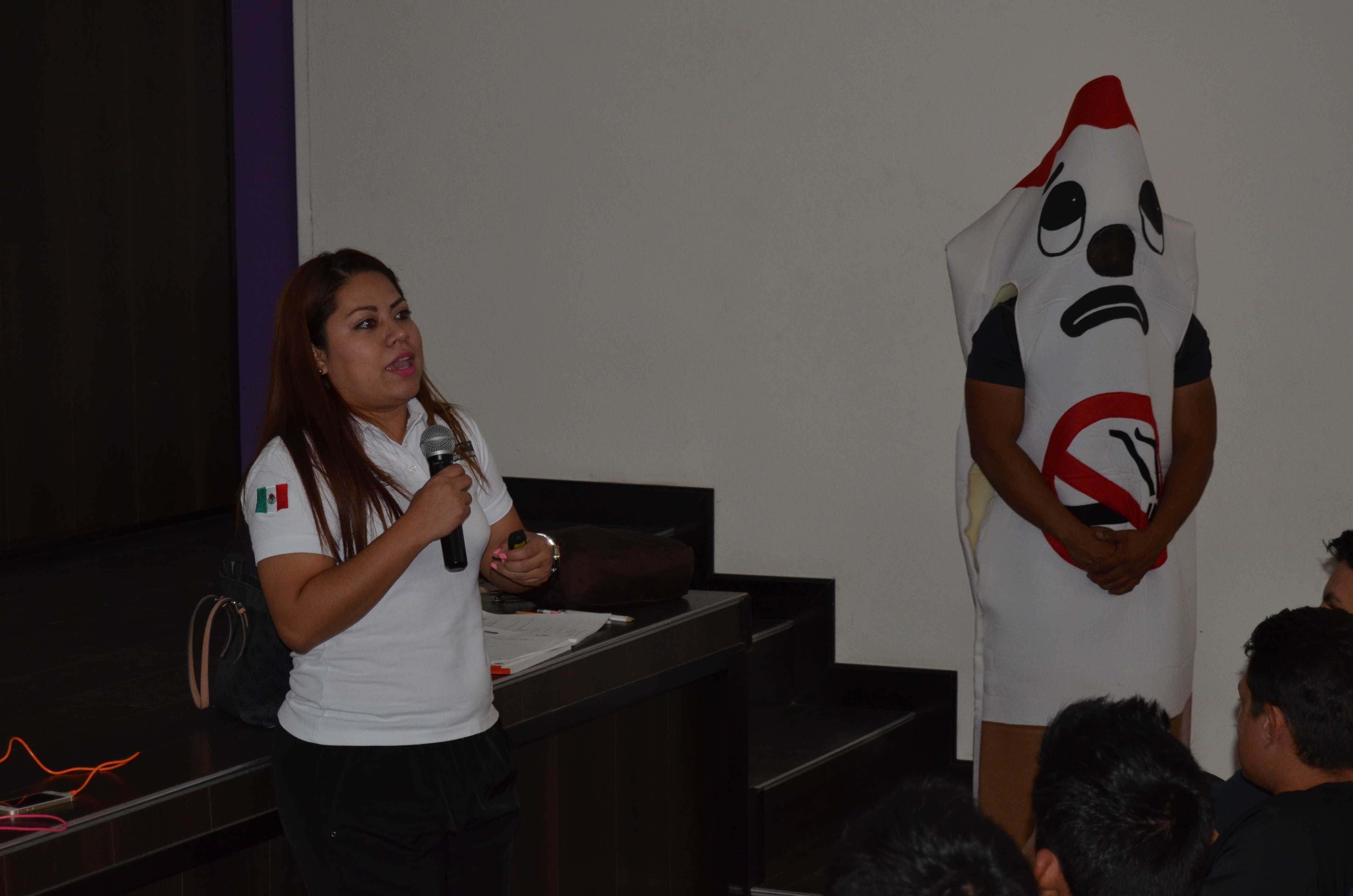 La conferencista, explico a los alumnos el gran daño que ocasiona solo respirar el humo del tabaco, ya que contiene más de 4 000 productos químicos, de los cuales se sabe que al menos 250 son nocivos, y más de 50 causan cáncer.