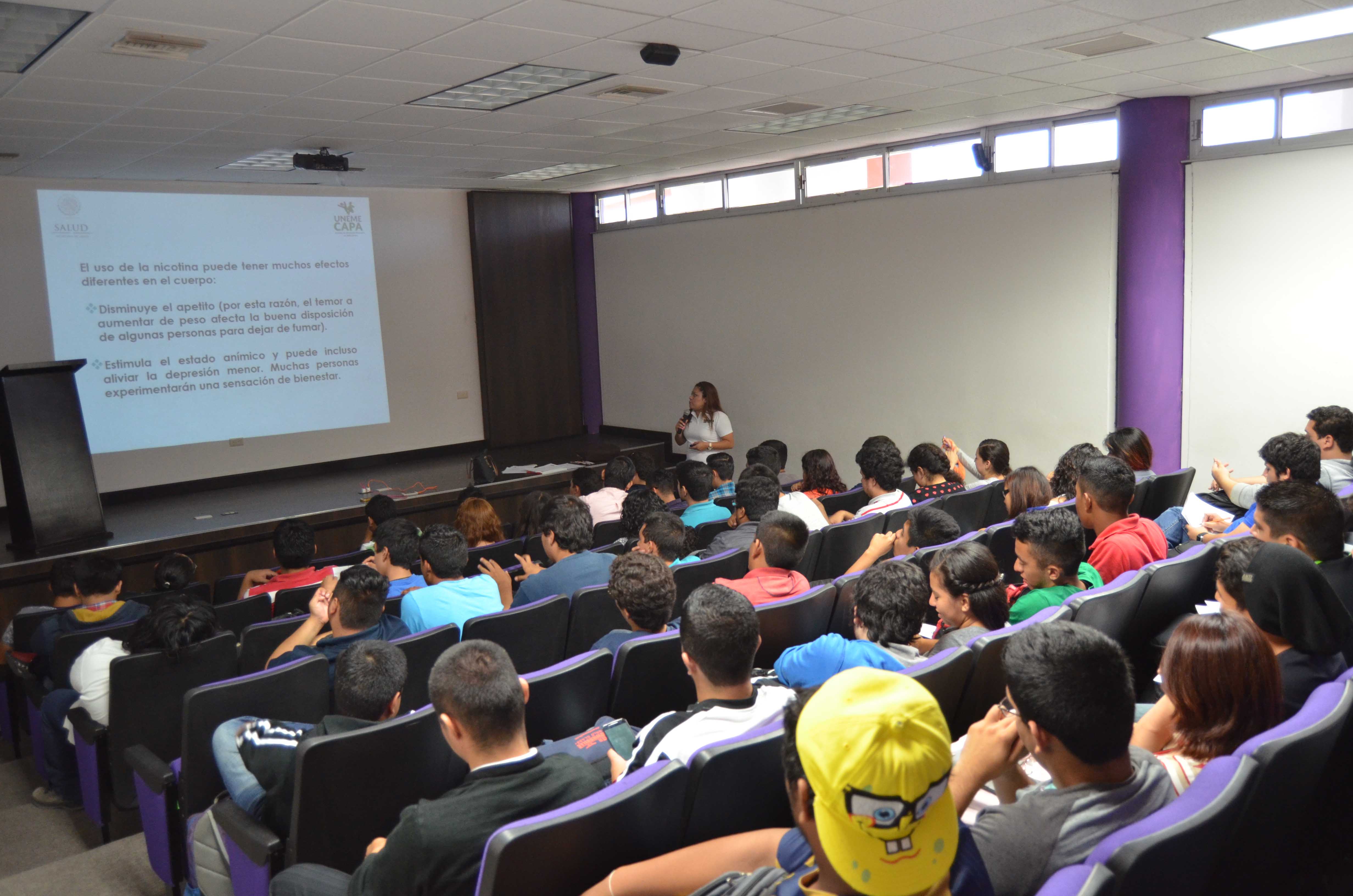 - Fue impartida por personal de la Unidad de Especialidades Médicas, del Centro de Atención Primaria en Adicciones, a través de la Unidad de Servicios Estudiantiles, señalo la Rectora, Mtra. Sonia Maricela Sánchez Moreno.