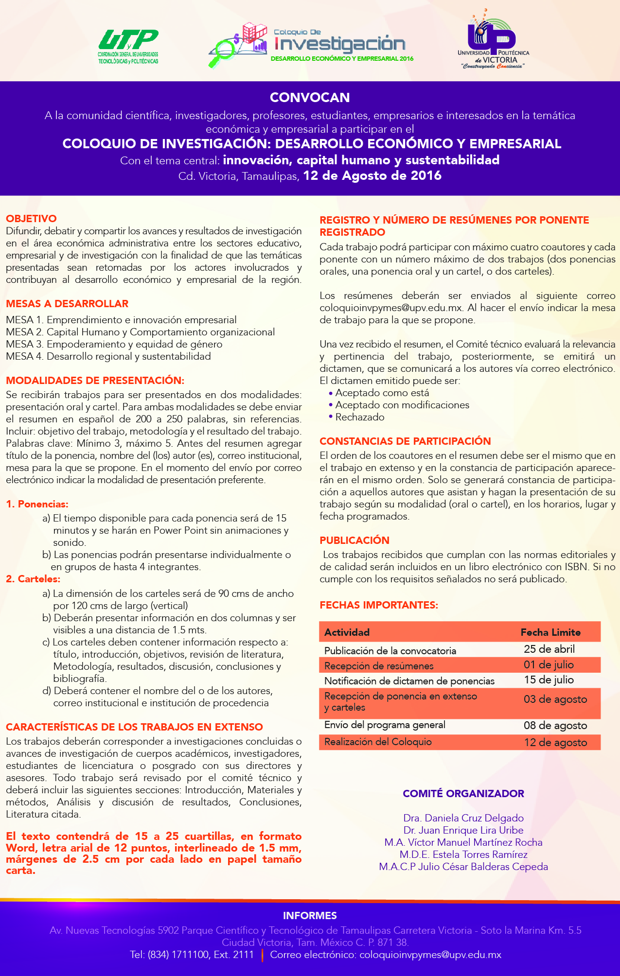 El Coloquio de Investigación: Desarrollo Económico y Empresarial que organiza la Universidad Politécnica de Victoria (UPV), con el tema “Innovación, capital humano y sustentabilidad” se realizará el 12 de agosto del año en curso, con el objetivo de difundir, debatir y compartir resultados de investigación en el área económica administrativa entre los sectores educativos, empresarial y de investigación, señaló la Rectora. Mtra. Sonia Maricela Sánchez Moreno.