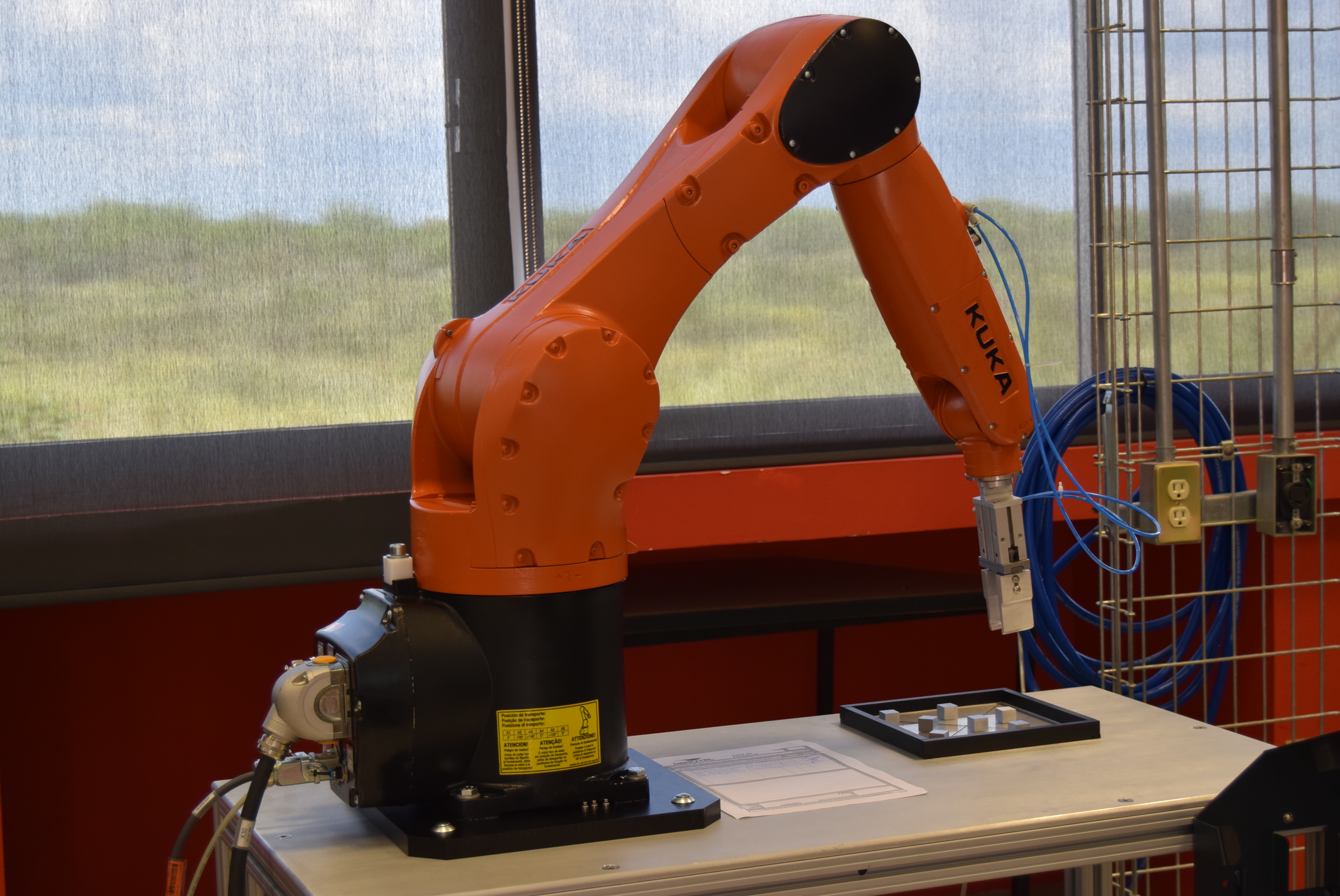 - Se adquirió el robot que cuenta con Controlador “Kuka Robotics”, Unidad de Programación (Smart Pad), Actuador para robot (Gripper) y la mesa habilitada para su propia instalación.