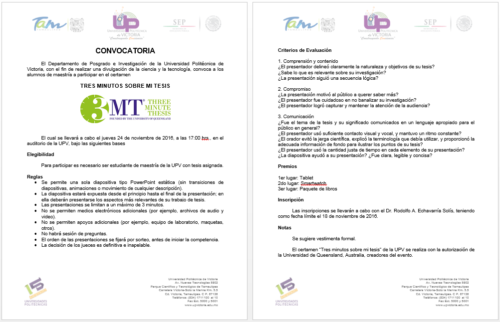 Mañana jueves 24 de noviembre a las 17 horas se realizará el certamen “Tres minutos sobre mi tesis”, organizado por el Departamento de Posgrado e Investigación de la Universidad Politécnica de Victoria (UPV), a fin de impulsar la divulgación de la ciencia y la tecnología, expresó la Rectora, Mtra. Sonia Maricela Sánchez Moreno.