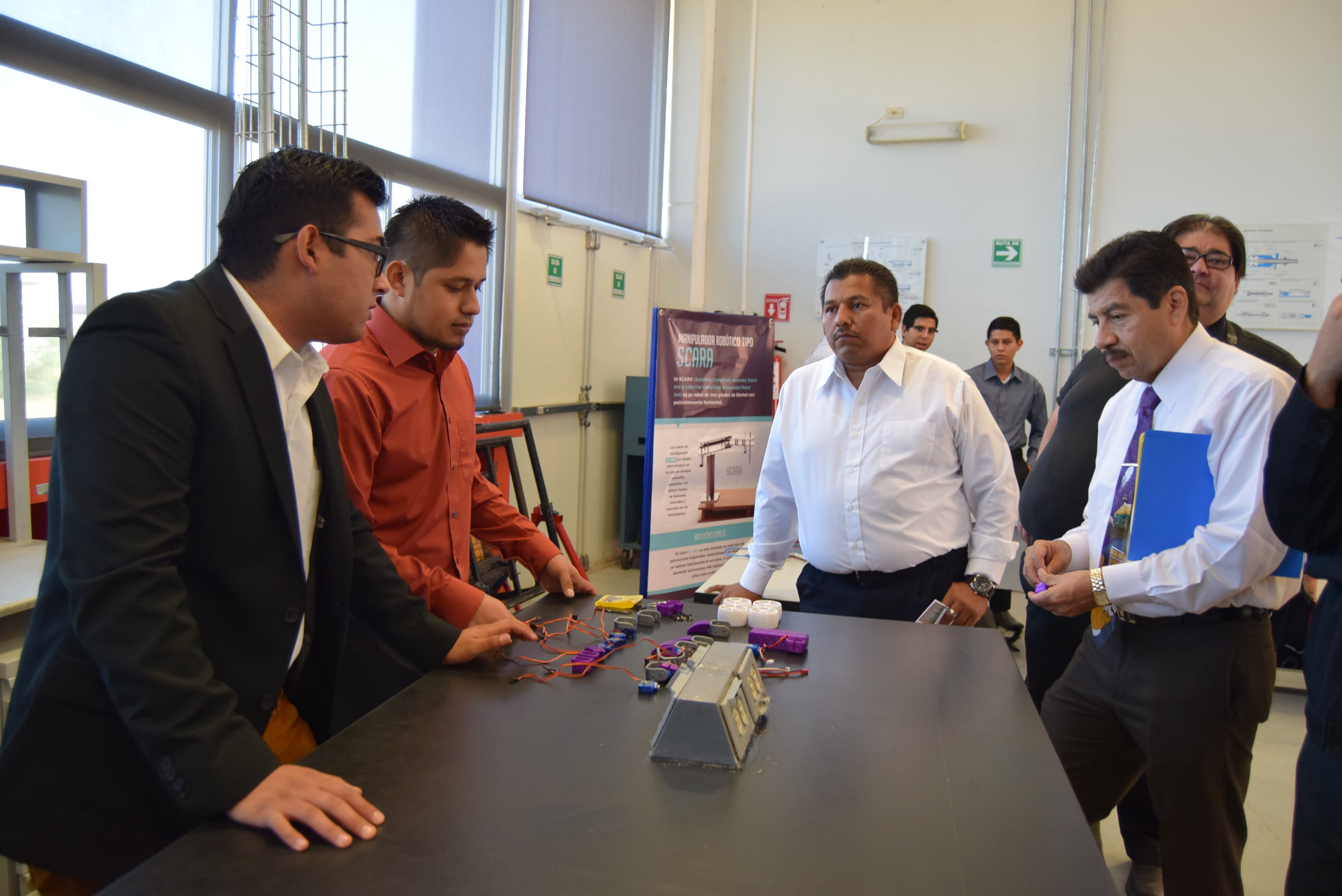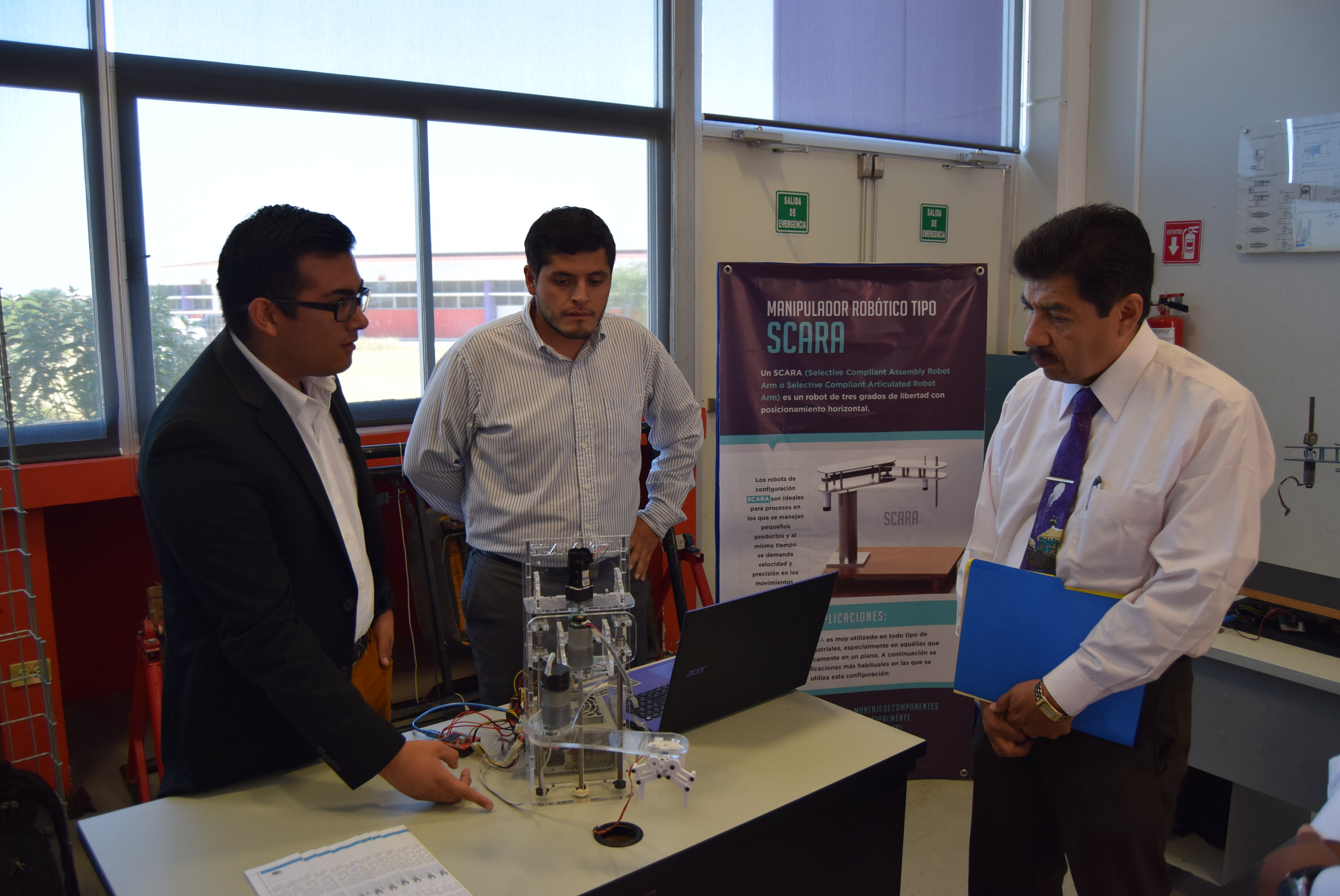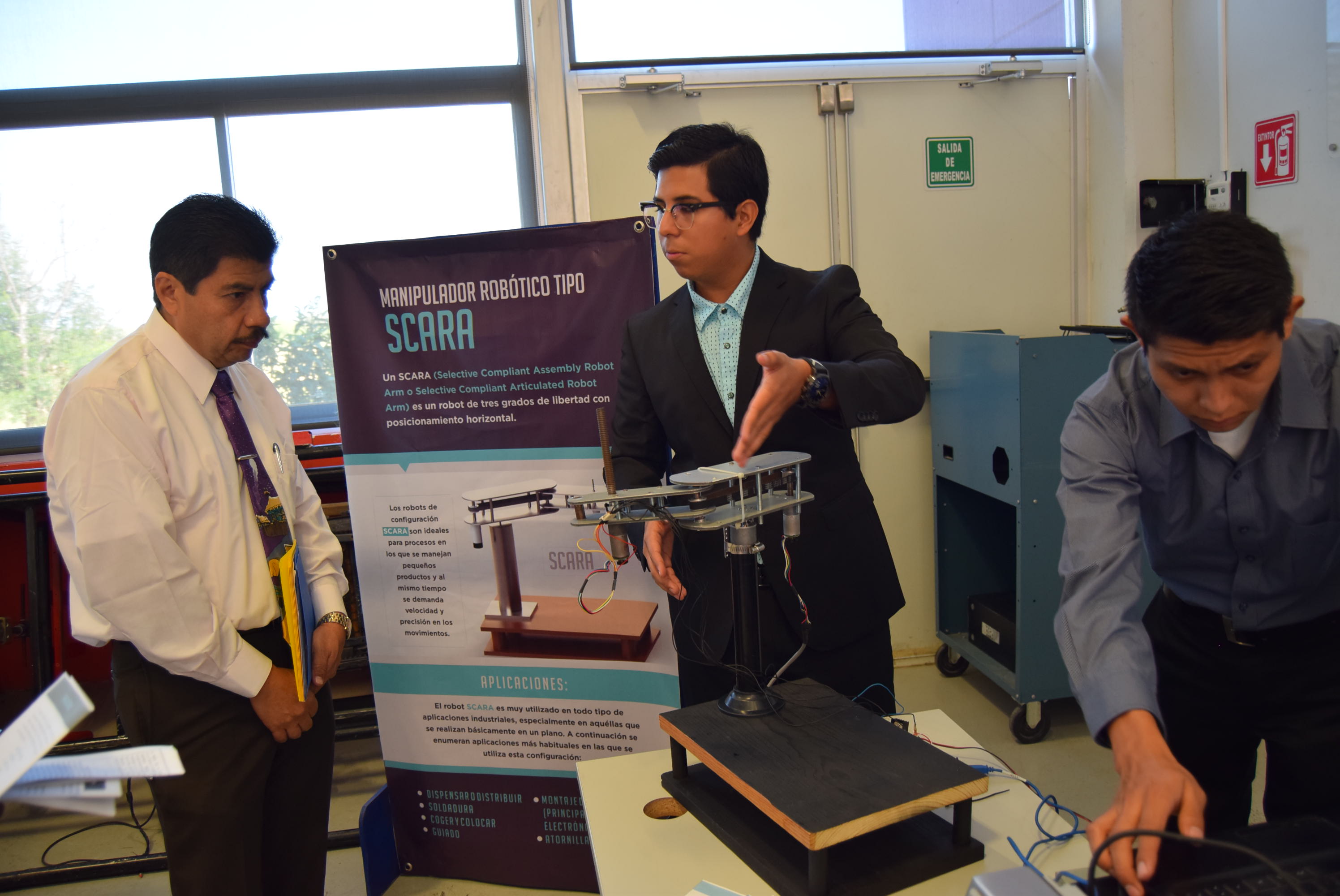 “Manipuladaor Robótico Tipo Scara“, de estudiantes del noveno cuatrimestre. Los robots Scara son utilizados en todo tipo de aplicaciones industriales, especialmente en aquellas que se realizan básicamente en un plano como: dispensar o distribuir, soldadura, coger y colocar, guiar, montaje de componentes y tornillos.