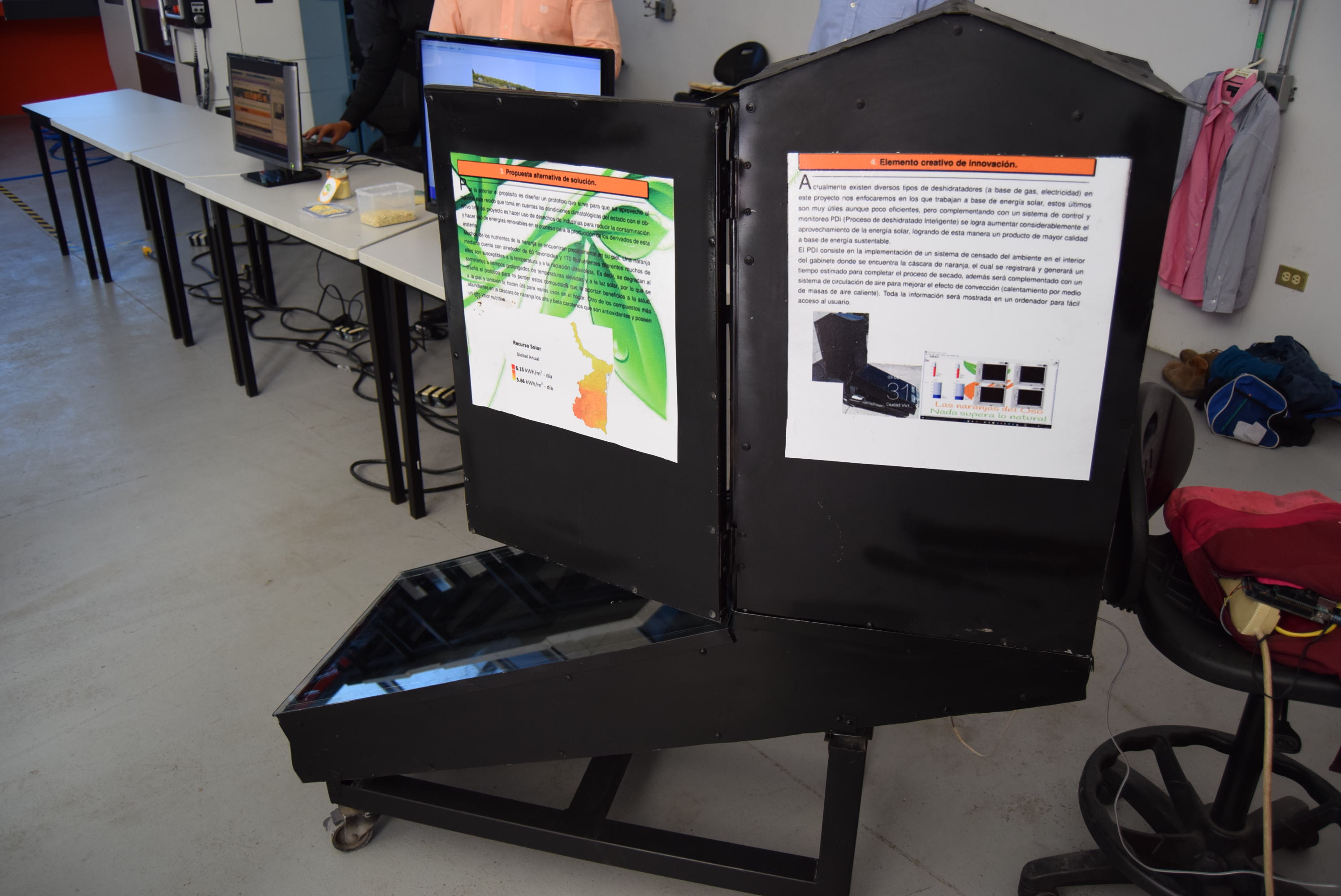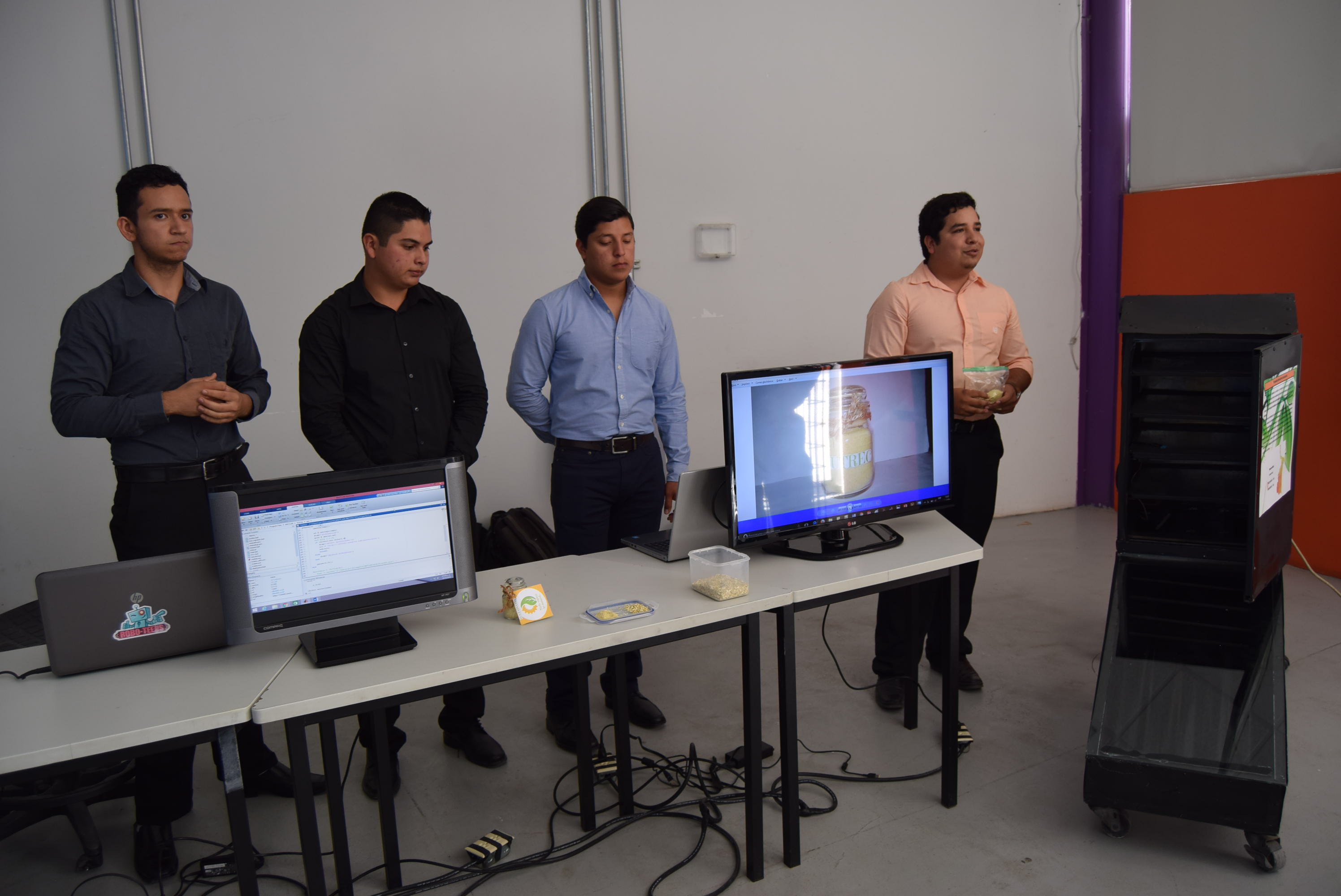 “Dispositivo Sustentable Diseñado para el Aprovechamiento de Cáscara de Naranja Residual”, de estudiantes del noveno cuatrimestre, en el cual se pretende con este dispositivo disminuir la contaminación que generan las empresas jugueras y utilizar el polvo de la cáscara de naranja que se generaría y venderlo al ramo farmacéutico y alimenticio.
