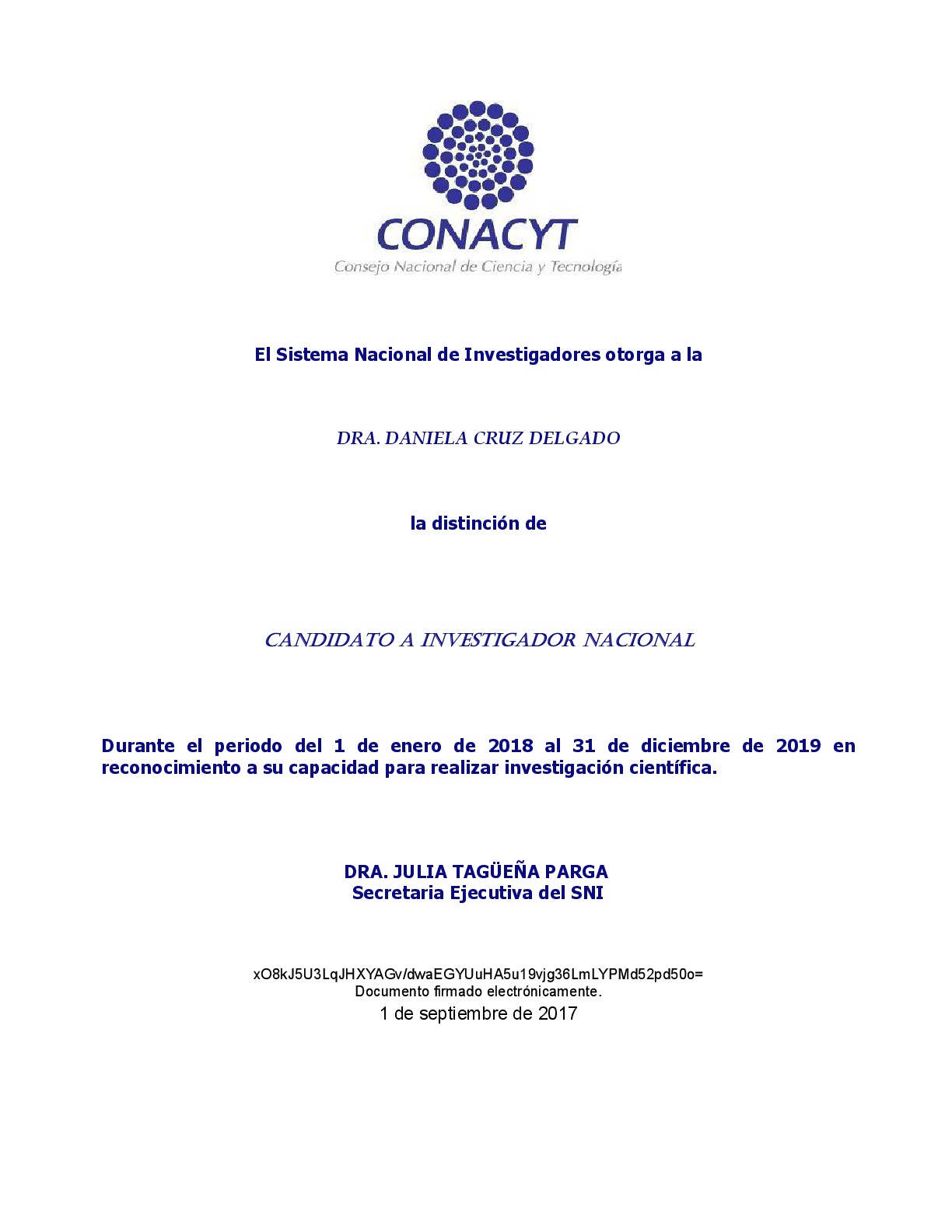 - La Dra. Daniela Cruz Delgado tendrá vigencia hasta el 31 de diciembre de 2019, en base a su productividad científica y publicación de diversos artículos en revistas indexadas.