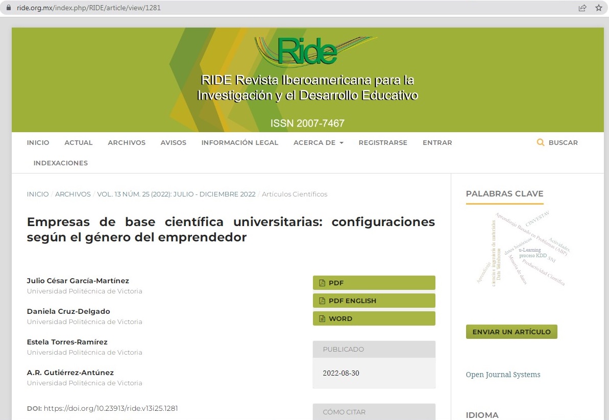 En el marco del desarrollo del proyecto “Factores Determinante de la Formación de Empresas de Base Tecnológica” el Dr. Julio César García Martínez, la Dra. Daniela Cruz Delgado y la Maestra Estela Torres Ramírez, de la Universidad Politécnica de Victoria y Aimé Renata Gutiérrez Antúnez de la Universidad del Valle de México lograron la publicación de su artículo “Empresas de base científica universitarias: configuraciones según el género del emprendedor”, en la Revista Indexada RIDE (Revista Iberoamericana para la Investigación y el Desarrollo Educativo).