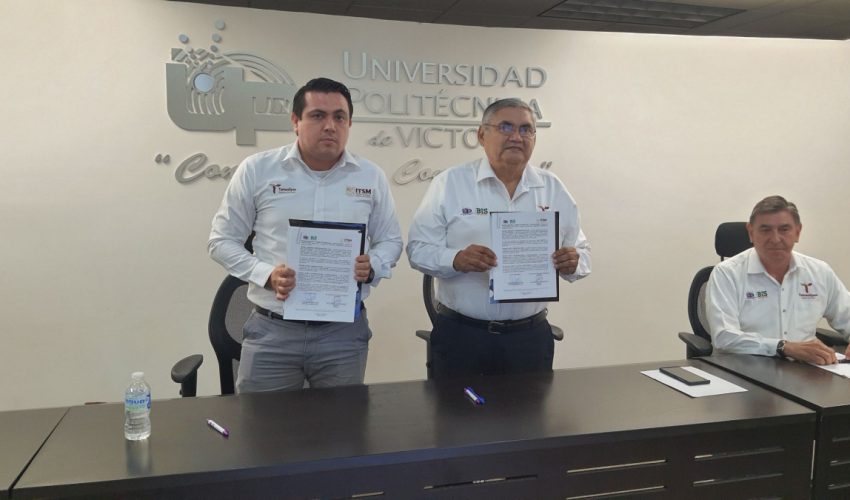 La Universidad Politécnica de Victoria (UPV) y el Instituto Tecnológico Superior de El Mante firmaron el miércoles 28 de septiembre del mes en curso, un Convenio de Colaboración para trabajar en proyectos comunes de base tecnológica y sustentable con impacto social que beneficien a Tamaulipas y a México, ceremonia realizada y presidida por el anfitrión Maestro Raúl Villanueva Niño, Encargado de Rectoría y Secretario Administrativo de la Institución, con la asistencia del Maestro Jesús Alberto Moctezuma Sandoval, Director General del plantel mantense.