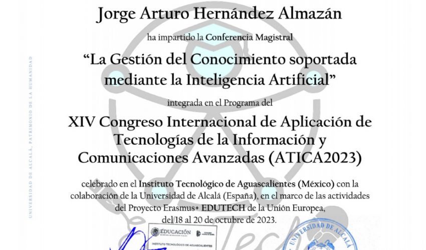 El Dr. Jorge Arturo Hernández Almazán presentó la Conferencia Magistral, titulada: “La Gestión del Conocimiento soportada mediante la Inteligencia Artificial” en la más reciente edición  del Congreso Internacional ATICA – en modalidad virtual – organizada por el Instituto Tecnológico de Aguascalientes (TeNM)  de México y la Universidad de Alcalá (UAH) de España, en el marco del proyecto Erasmus+ de la Unión Europea EduTech en el que participan la Universidad Alcalá (España), Universidad Politécnica Salesiana (Ecuador), Universidad del Azuay (Ecuador), Universidad Veracruzana (México), Instituto Tecnológico de Aguascalientes (México), Østfold University College (Noruega), Universidad de Alicante (España) y Universidad Aberta (Portugal).