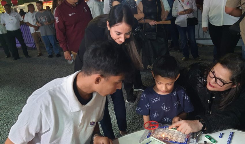 En su visita al stand de la UPV el Gobernador Villarreal Anaya y la Secretaria de la SET Castillo Pastor, así como la Rectora Ramírez Erazo interactuaron con un grupo de niños que recibían indicaciones sobre juegos electrónicos, con los cuales mostraron su inicial gusto por la ciencia y la tecnología.