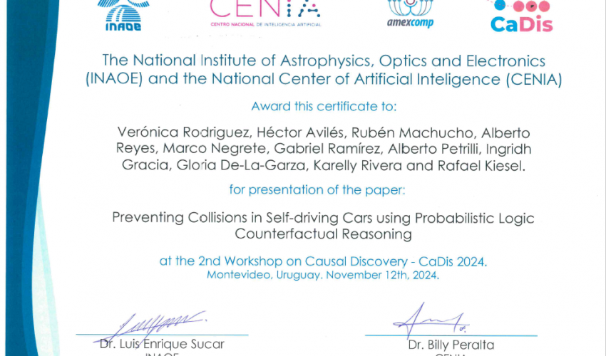El Profesor Investigador de la Universidad Politécnica de Victoria (UPV), Rubén Machucho Cadena, perteneciente al programa académico de Ingeniería en Sistemas Automotrices (ISA) acudió el 11 de noviembre del año en curso a la ciudad de Montevideo, Uruguay, donde expuso importante ponencia en el evento CADIS 2024, sobre un método de razonamiento contrafactual para prevenir colisiones en vehículos autónomos, utilizando redes gemelas de lógica probabilística (PLTNs).