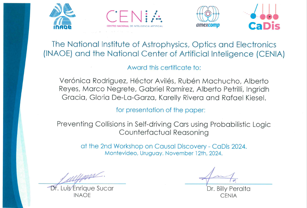 El Profesor Investigador de la Universidad Politécnica de Victoria (UPV), Rubén Machucho Cadena, perteneciente al programa académico de Ingeniería en Sistemas Automotrices (ISA) acudió el 11 de noviembre del año en curso a la ciudad de Montevideo, Uruguay, donde expuso importante ponencia en el evento CADIS 2024, sobre un método de razonamiento contrafactual para prevenir colisiones en vehículos autónomos, utilizando redes gemelas de lógica probabilística (PLTNs).
