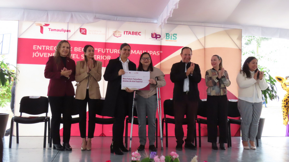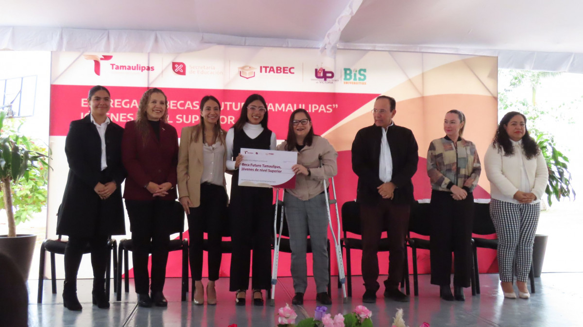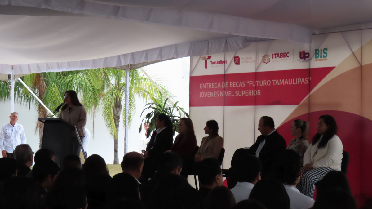 La Maestra Lucía Aimé Castillo Pastor, Secretaria de Educación de Tamaulipas presidió la ceremonia de entrega de Becas “Futuro Tamaulipas Jóvenes de Nivel Superior ” en la Universidad Politécnica de Victoria (UPV), con la anfitronía de la Rectora, Maestra Abril Alejandra Ramírez Erazo y la presencia del Director General del Instituto Tamaulipeco de Becas, Estímulos y Créditos Educativos (ITABEC), Juan Guillermo Mansur Arzola, así como de Ana Isabel Lerma González representante del Subsecretario de Educación Media y Media Superior de la SET Guadalupe Acosta Villarreal, de Gloria González González, Directora General del Instituto de Educación para Adultos ITEA y de Amelia Castillo Morán, Rectora del Centro Regional de Formación Docente e Investigación Educativa de Tamaulipas (CRETAM).
