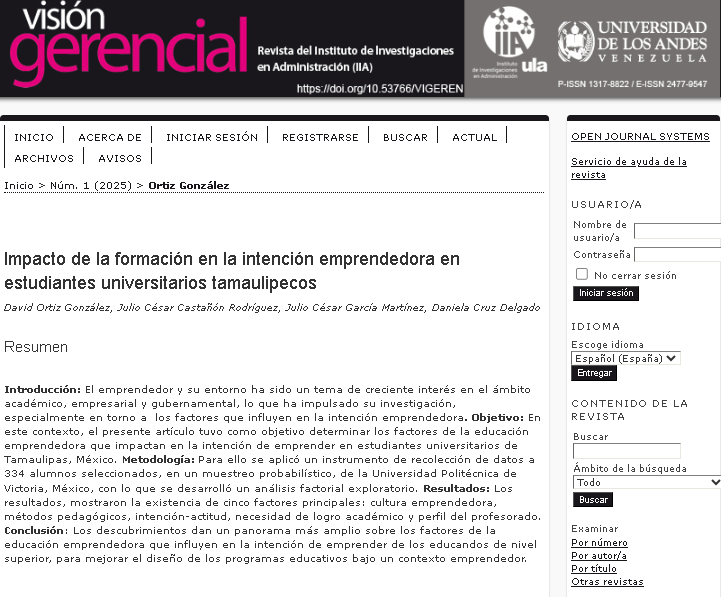Los Profesores Investigadores de la Universidad Politécnica de Victoria (UPV) doctores David Josué Ortiz González, Julio César García Martínez y Daniela Cruz Delgado, así como Julio César Castañón Rodríguez (UAT), desarrollaron un interesante trabajo titulado «Impacto de la formación en la intención emprendedora en estudiantes universitarios tamaulipecos”, que fue publicada en la reconocida revista internacional Visión Gerencial. Este estudio, fue realizado en colaboración con la Universidad Autónoma de Tamaulipas (UAT) y representa un importante avance en la comprensión del emprendimiento juvenil en la región.