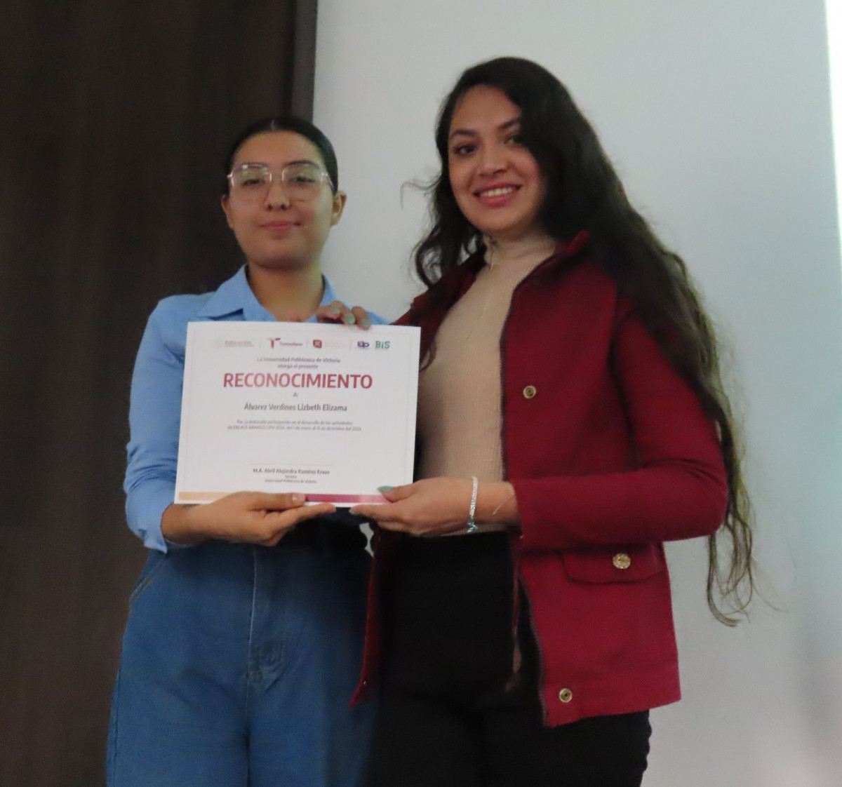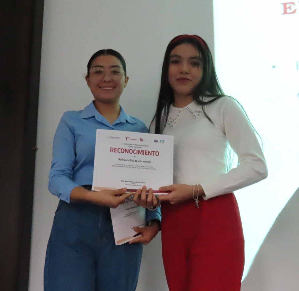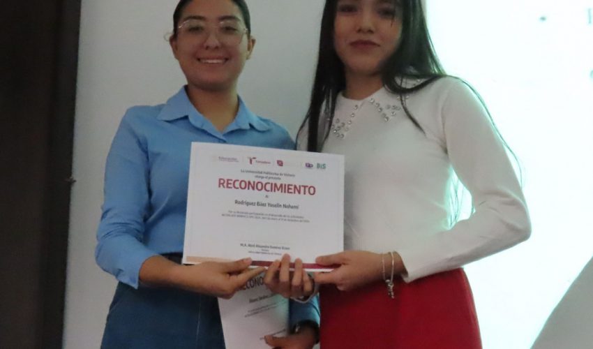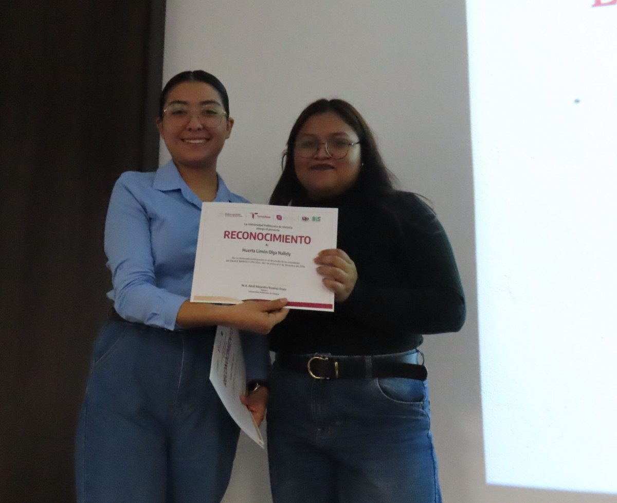 A nombre de la Rectora Abril Alejandra Ramírez Erazo, la directora del programa académico de Licenciatura en Administración, Maestra Estela Torres Ramírez, entregó sendos Reconocimientos y felicitó a Brisa Celeste y a su equipo de trabajo, además de invitar al equipo a continuar el esfuerzo de vincular a la UPV y al Banco de México en las acciones que favorezcan la educación superior.