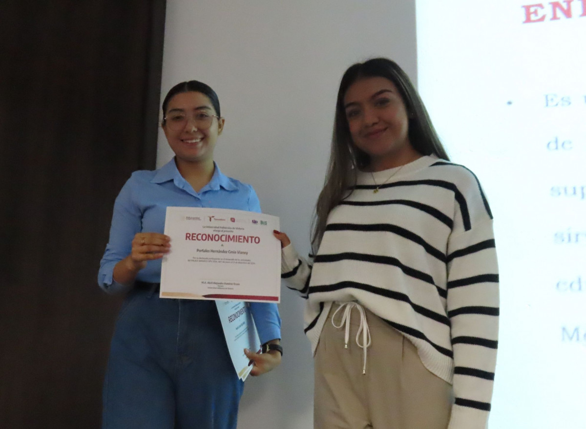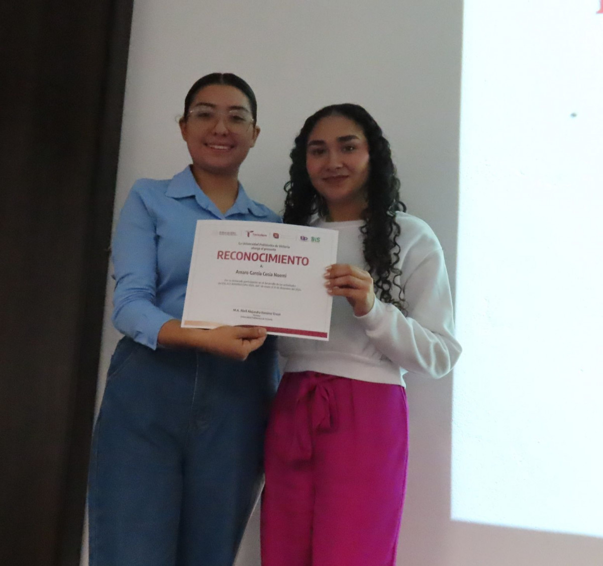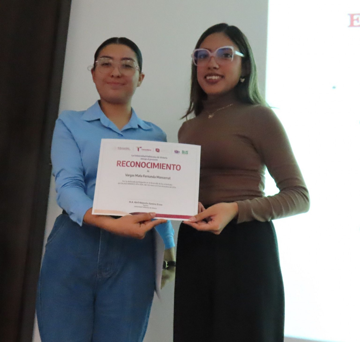 A nombre de la Rectora Abril Alejandra Ramírez Erazo, la directora del programa académico de Licenciatura en Administración, Maestra Estela Torres Ramírez, entregó sendos Reconocimientos y felicitó a Brisa Celeste y a su equipo de trabajo, además de invitar al equipo a continuar el esfuerzo de vincular a la UPV y al Banco de México en las acciones que favorezcan la educación superior.
