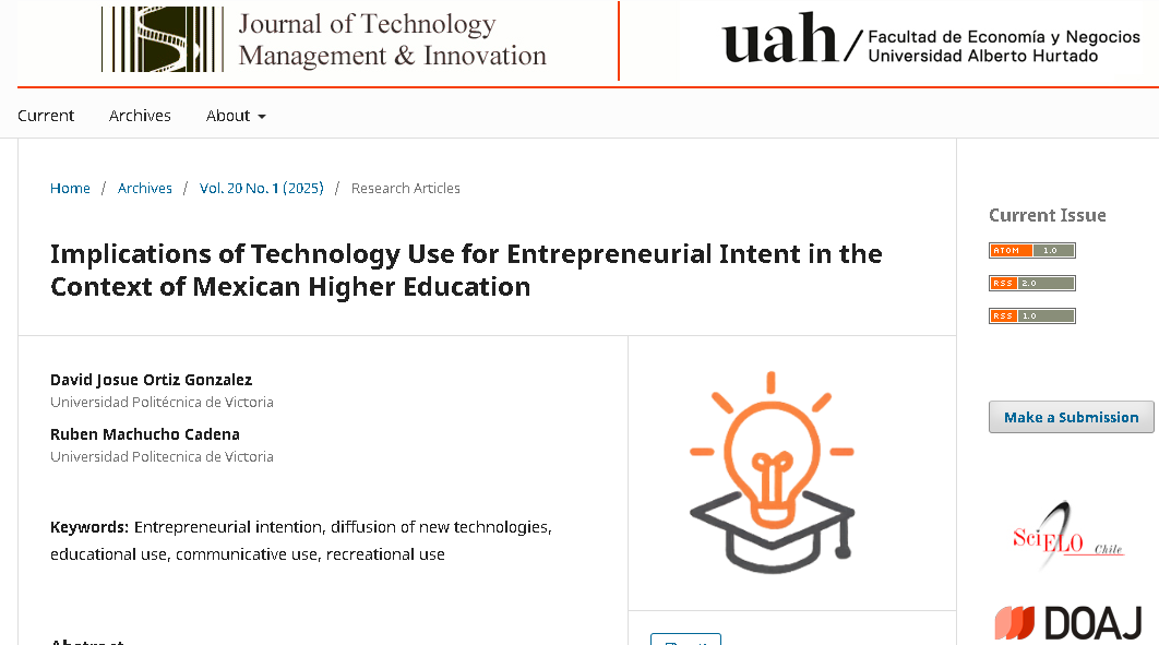 Los Profesores Investigadores Dr. David Josué Ortiz González y Dr. Rubén Machucho Cadena, de la Universidad Politécnica de Victoria (UPV), publicaron el artículo titulado “Implications of Technology Use for Entrepreneurial Intent in the Context of Mexican Higher Education” en la revista Journal of Technology Management & Innovation, volumen 20, número 1, páginas 3–14.