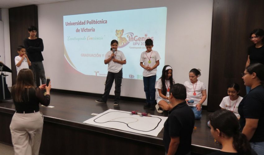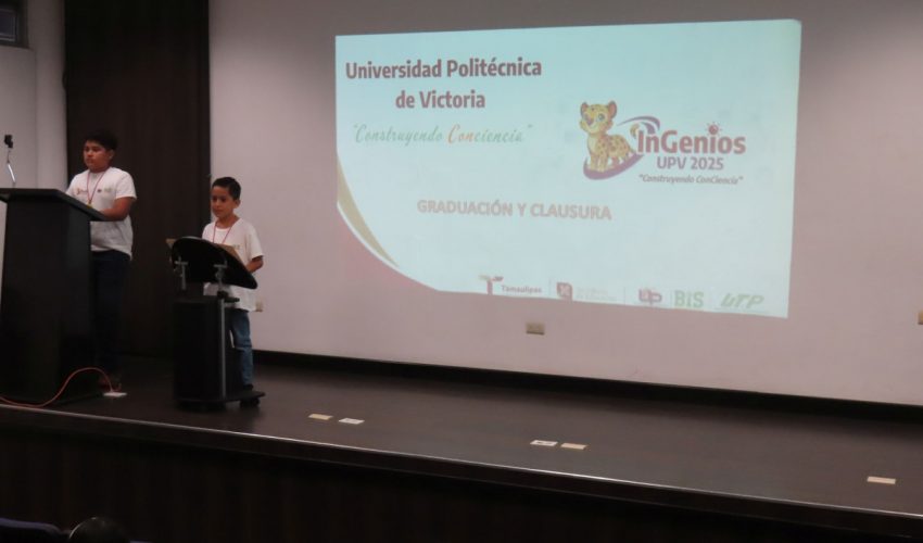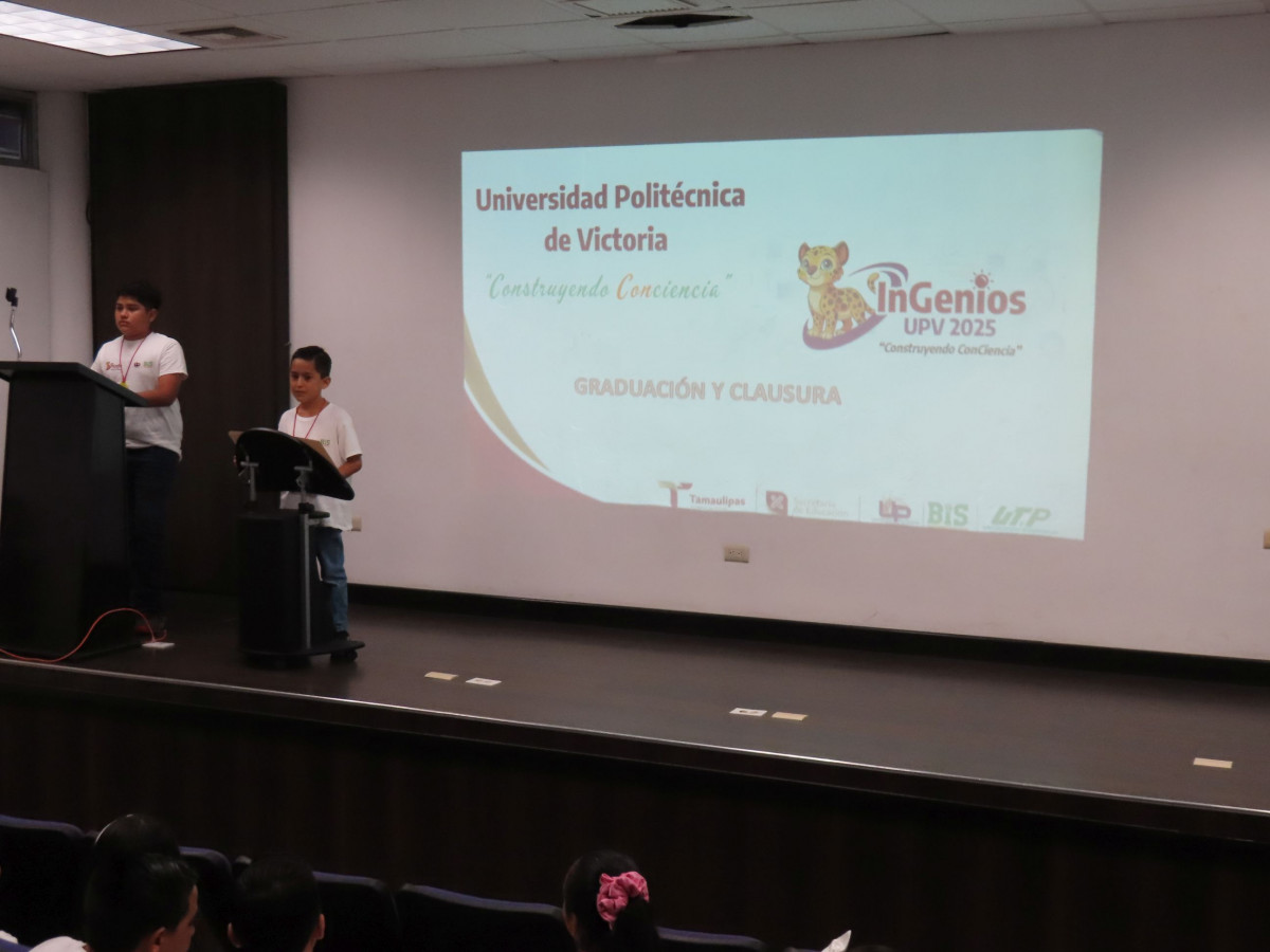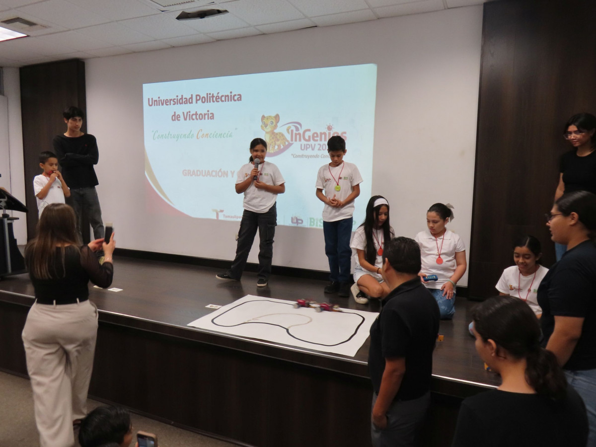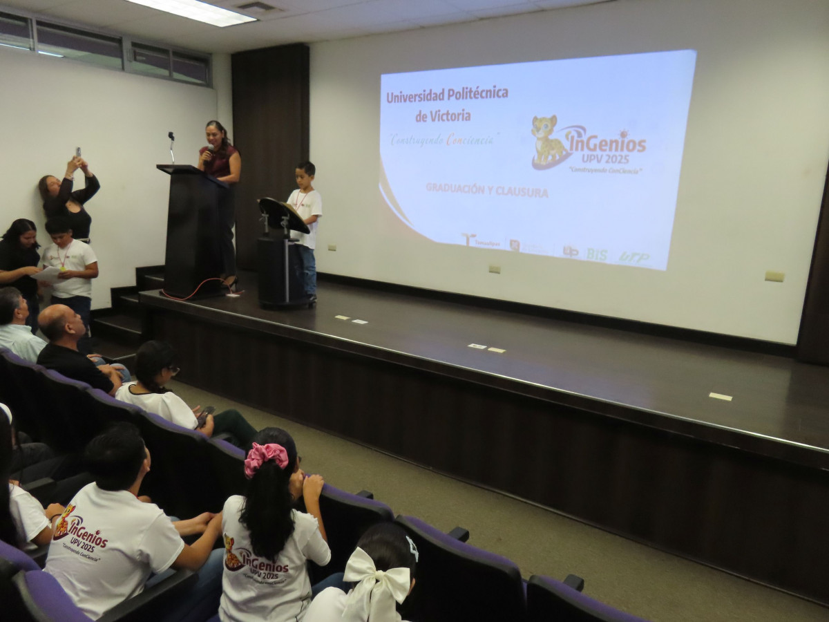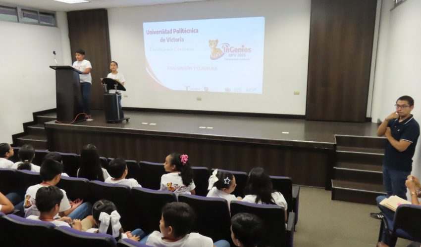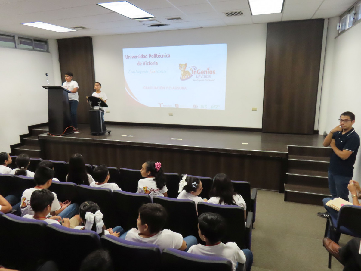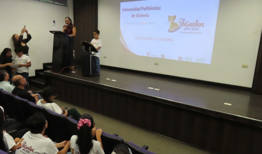 Un grupo de 23 niñas y niños entre los 9 y 12 años de edad mostraron amplios conocimientos al presentar con éxito sus proyectos finales de fin de curso en la ceremonia de graduación de la Incubadora de Genios 2025, de la Universidad Politécnica de Victoria (UPV), llevada a cabo el jueves 17 de julio, en el Auditorio de la Institución.
