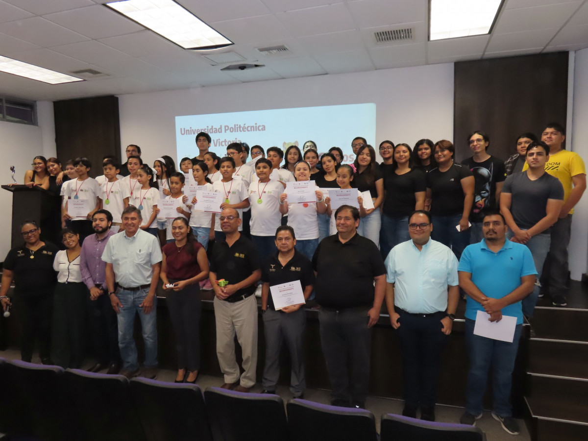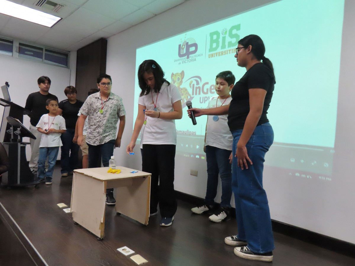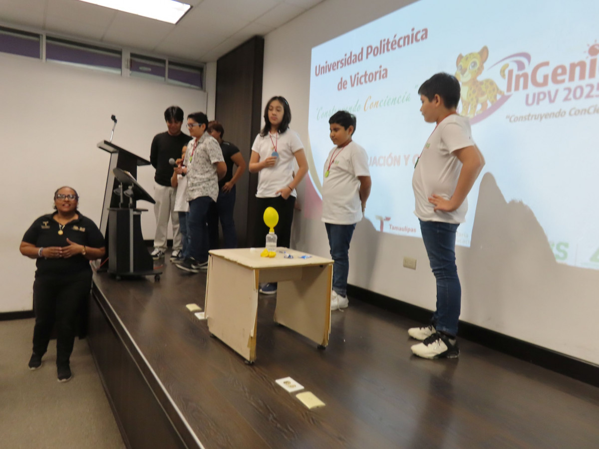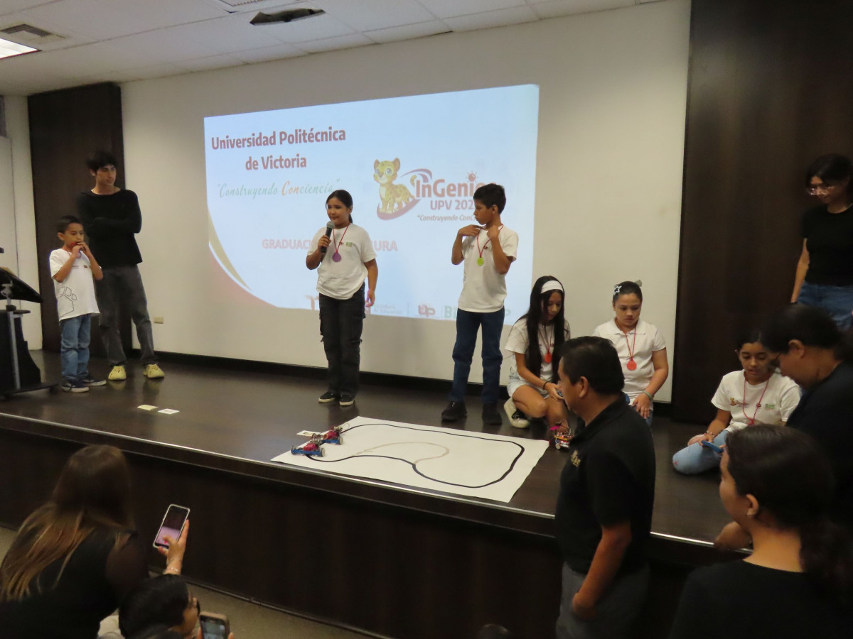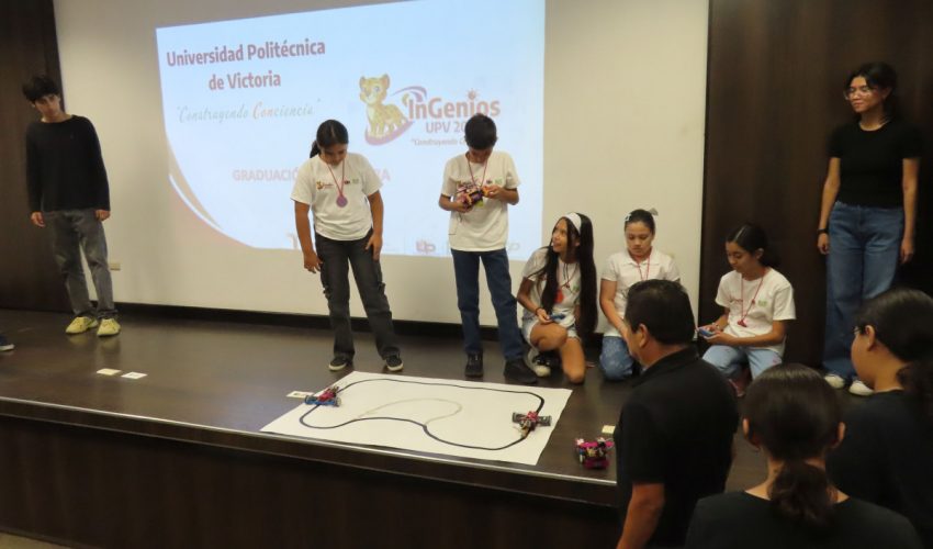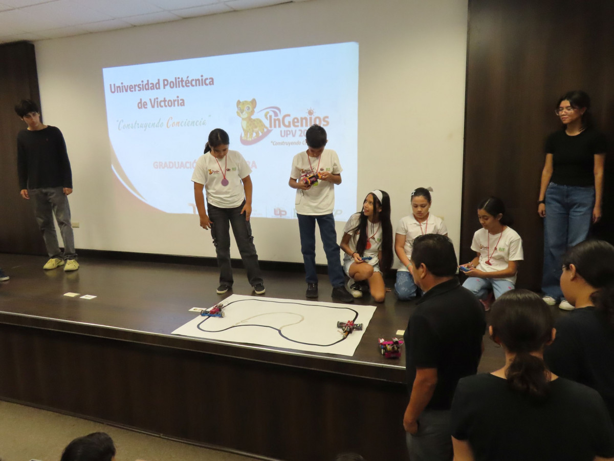 Un grupo de 23 niñas y niños entre los 9 y 12 años de edad mostraron amplios conocimientos al presentar con éxito sus proyectos finales de fin de curso en la ceremonia de graduación de la Incubadora de Genios 2025, de la Universidad Politécnica de Victoria (UPV), llevada a cabo el jueves 17 de julio, en el Auditorio de la Institución.