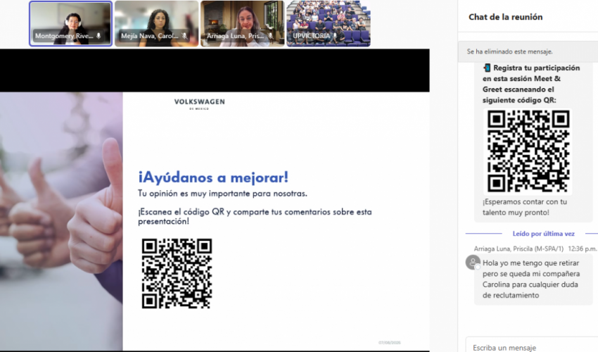 La interacción por parte de la empresa Volkswagen de México y la UPVictoria se realizó por video conferencia, para invitar a nuestros estudiantes a participar en el programa «Talento Joven Primavera 2026» en donde los universitarios politécnicos de los programas académicos mencionados recibieron la explicación para efectuar sus prácticas profesionales en la planta de Puebla, Puebla o en la de Silao, Guanajuato.